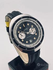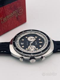 Raro e bellissimo Eberhard Contograf ref. 1.31504-39 in eccellenti condizioni, pari al nuovo, e completamente originale, risalente al 1970 circa. Cassa jumbo in acciaio da 43mm, quadrante e lancette hanno sviluppato una meravigliosa patina del tempo e sono in condizioni perfette. Corona originale marcata Eberhard, ghiera girevole con inserto in bachelite intatto, cinturino in pelle nuovo.