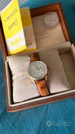 Si tratta di un Eberhard Extra Fort, un orologio vintage di grande fascino e valore storico. È un modello risalente al 1960, caratterizzato da un movimento meccanico a carica manuale, tipico dell’alta orologeria dell’epoca, che richiede la ricarica quotidiana tramite la corona. La cassa è realizzata in oro 18 carati, elemento che ne aumenta sia il pregio sia il valore collezionistico. Le dimensioni sono di 39 mm (esclusa la corona), una misura piuttosto importante per l’epoca, che rende l’orologio ancora oggi ben portabile e attuale al polso. Il quadrante è stato rifatto, quindi non è quello originale montato in fabbrica; tuttavia, viene fornito anche il quadrante originale sostituito, dettaglio importante per i collezionisti che vogliono mantenere la storicità del pezzo. Completano la dotazione una custodia in legno d’epoca e una garanzia, che aggiungono valore e affidabilità all’acquisto. In sintesi: un classico cronografo/tre sfere vintage (a seconda della configurazione specifica), elegante e ricercato, ideale per chi cerca un orologio in oro con storia e personalità.