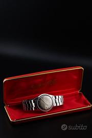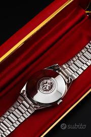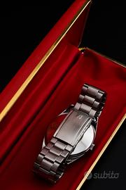 Eberhard Scafodat Automatic – Anni ’60 – Ghost Dial – Bracciale Eberhard originale firmato – 35 mm Propongo in vendita un incredibile Eberhard & Co. Scafodat Automatic degli anni ’60, completamente coevo in ogni sua parte e già revisionato compreso anche di scatola originale. Uno dei modelli più affascinanti della produzione sportiva-elegante Eberhard, qui in una configurazione rara e collezionisticamente molto interessante: quadrante ghost originale, datario roulette, corona logata e bracciale firmato dell’epoca. Un esemplare autentico, coerente e dal fascino magnetico. Caratteristiche principali •Marca: Eberhard & Co. •Modello: Scafodat Automatic •Periodo: Anni ’60 •Movimento: Meccanico a carica automatica •Cassa: Acciaio inox •Diametro: 35 mm (esclusa corona) •Quadrante: Originale “ghost” con patina naturale uniforme •Datario: Roulette (alternanza nero/rosso) •Indici: Applicati con lume coevo •Corona: Originale logata •Vetro: Plexiglass •Bracciale: Raro bracciale originale firmato Eberhard Condizioni L’orologio si presenta in ottime condizioni generali, completamente coerente e originale. Il quadrante ghost sviluppa una patina omogenea e affascinante, che dona profondità e unicità al pezzo senza compromettere la leggibilità. La cassa mantiene proporzioni armoniose, il bracciale firmato è perfettamente integrato e raramente si trova ancora presente su questi modelli.