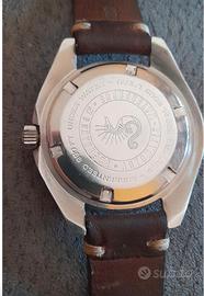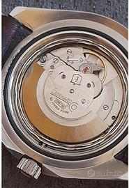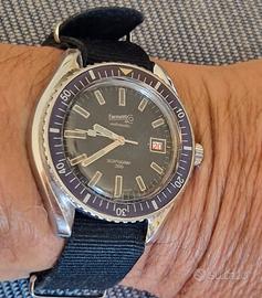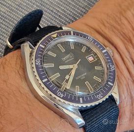 orologio vintage anni 1964/65 Eberhard Scafograf 300 Automatico Ref.26013 Quadrante nero 'Stick indexes' Cassa acciaio diametro 43mm Ghiera girevole bidirezionale integra Corona originale firmata "E" di Eberhard Quadrante con indici e lancette al trizio(marcato Swiss Made T) Data al 3 "roulette" (numeri pari Rossi / numeri dispari Neri) Fondello a vite con incisione del 'Cavalluccio Marino" Movimento Automatico di manifattura Eberhard. Originale ed in ottime condizioni VENDO O PERMUTO/SCAMBIO CON OROLOGIO DI PARI PREGIO E VALORE.
