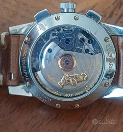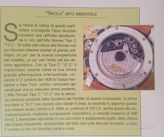 Movimento automatico Valjoux 7750 modificato e rifinito ad alto livello, viti azzurrate con ponti e platina decorate a perlage, rotore rifinito a cotes de geneve con bassorilievo in oro dell'Alfa Romeo Tipo C del 1936 di Tazio Nuvolari.
