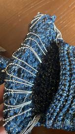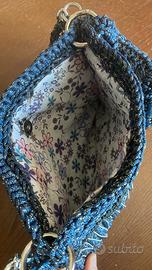 Un blu notte che cattura la luce e non passa inosservato: questa borsa a spalla è realizzata a mano all'uncinetto con cordincino brillantinato, che regala un effetto luminoso e prezioso sia di giorno che di sera. Le frange in catene argentate lungo il bordo inferiore aggiungono movimento e carattere, rendendola un accessorio dal tocco deciso e raffinato allo stesso tempo. All'interno, la fodera in tessuto a fantasia floreale — con delicati fiorellini rosa e lilla su fondo bianco — crea un contrasto dolce e curato, un dettaglio che si nota e si apprezza. Il portamonete abbinato completa il set con coerenza di stile, pratico e coordinato in ogni occasione. 💙 Colore: blu notte brillantinato 🧵 Materiale: cordincino brillantinato 📐 Dimensioni: 25 x 18 cm circa 🎁 Set incluso: borsa + portamonete coordinato 🔘 Chiusura: bottone a calamita 👜 Utilizzo: a spalla o a mano ✨ Dettagli: frange in catene argentate, anelli argentati 🌸 Fodera: tessuto fantasia floreale 🌿 Lavorazione: 100% fatta a mano all'uncinetto