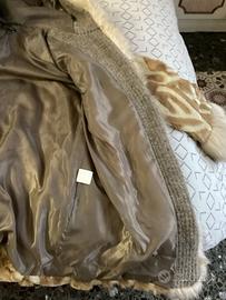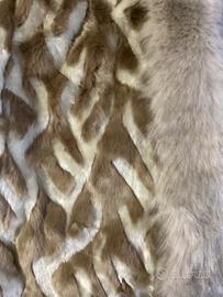 Pelliccia ecologica sintetica con cappuccio, molto ben rifinita con bordi interni in lana. Colore beige e bianco.