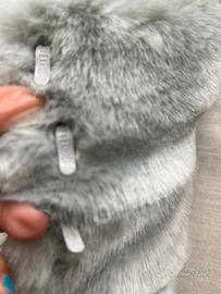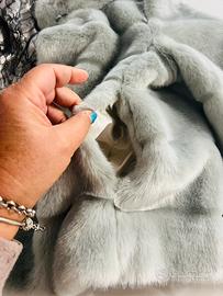 In tessuto velour color grigio perla, senza applicazioni, tinta unita, collo tondo, maniche a 3/4, chiusura con gancetti, con tasche foderate.