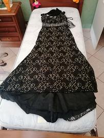 Abito da cerimonia elegante e raffinato con coda. Colore nero e oro, impreziosito da perline che formano una cinta sottoseno. Tessuto leggero che consente ottima libertà di movimento. Ottima vestibilità, indossato solo una volta. Taglia 44/46.
