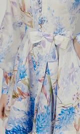 Splendido abito realizzato in100% linodi alta qualità, arricchito da una fodera in100% leggero cotoneche assicura freschezza e morbidezza sulla pelle. Il capo è decorato con una raffinatastampa floreale ad acquerellosui toni del blu e del glicine. Presenta un elegantecolletto alla coreana, una fila di bottoni rivestiti in tessuto e maniche lunghe dal taglio sartoriale. Lacintura coordinataevidenzia la silhouette con grazia. Un'ottima scelta per cerimonie estive, eventi formali o occasioni in cui l'eleganza incontra la naturalezza.