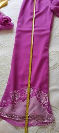 composto da kaftano, pantalone con elastico in vita e stola. ricami di perline e paillettes sulla camicia, sul pantalone e sulla stola. colore panna e fucsia. larghezza vita cm 38. lunghezza pantaloni cm 104. lunghezza blusa cm 80. larghezza spalle cm 35