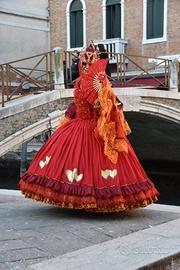 Elengante abito rosso realizzato e presentato al carnevale di Venezia .