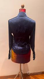 Elegante camicia blu con un design che valorizza la figura. •Made in Italy. •Tessuto satinato con finitura lucida. •Dettaglio di ruches sul davanti. •Maniche lunghe. •Colletto classico. •Bottoni rivestiti in passamaneria sui polsi. •Bottoni in madreperla. •100% viscosa. •Da ascella ad ascella: 80 cm •Lunghezza: 55 cm •Spalle: 40 cm •Vita: 70 cm