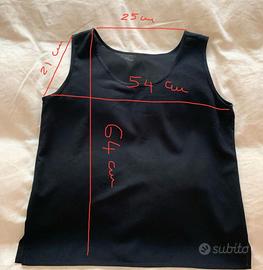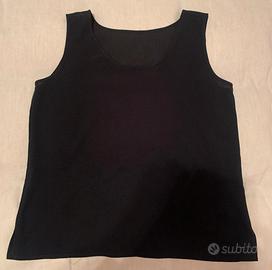 Si tratta di una canotta nera da donna, caratterizzata da uno scollo rotondo, da due piccoli spacchi laterali e da un'ottima vestibilità. La taglia è una XL italiana. La composizione del tessuto è 60% viscosa, 5% lycra e 35% poliestere. Raramente utilizzata è in ottime condizioni