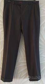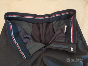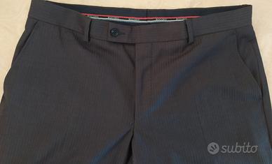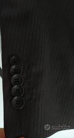Elegante classico completo da uomo in due pezzi, con giacca monopetto a due bottoni e pantaloni eleganti con battitacco. Colore grigio antracite con motivo a righe. Realizzato in poliestere e viscosa. Foderato internamente con impresso logo Made in Italy. Mai indossato Colore grigio/antracite