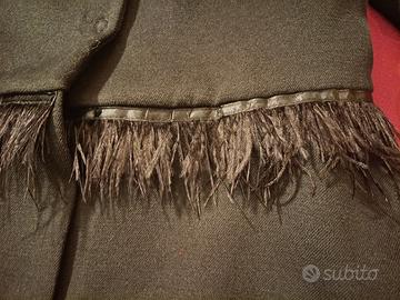 Elegante giacca da donna nera con applicazione di piume di struzzo sulla baschina, fodera interna in fantasia rigata bianca e nera, molto bella, mai indossata per errata taglia
