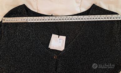 VENDO ELEGANTE MAGLIA/CARDIGAN COLORE NERO GLITTERATO, IN TESSUTO LUREX CON UN EFFETTO SCINTILLANTE, VISCOSA. CHIUSURA CON PICCOLI BOTTONI. MANICA LUNGA. TG. S/M (40/42). MISURE COME DA FOTO. NUOVA