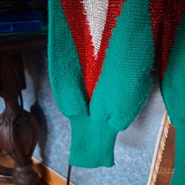 Bel maglione verde intenso con fascia di motivi geometrici di paillettes bianche e rosse e altri motivi che continuano uguali dietro e sulle maniche.