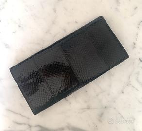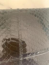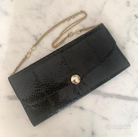 Elegante borsetta vintage anni '70 in pelle di rettile, pelletteria italiana G. Castellari Milano, colore nero lucido, con tracolla sottile a catena dorata che può essere "nascosta" all'interno per utilizzare la borsa come pochette, altezza 14 cm, larghezza 30 cm, profondità 1,5 cm, catena lunga 70 cm, peso 270 g, foderata all’interno con bustina portadocumenti con zip, in perfette condizioni vintage con leggeri segni del tempo sulle parti metalliche, con il tempo la doratura del bottone frontale si è leggermente schiarita, conserva comunque il suo antico fascino, ottima idea per regalo di Natale per lei, possibile anche ritiro a mano a Milano, zona Niguarda, con la formula visto e piaciuto.