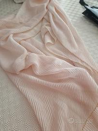 Di un pallido rosa cipria con bordura leggermente dorata e lavorazione plissettata.