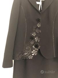 Elegante tailleur Maria Grazia Severi in pura lana vergine. Giacca e gonna midi che scende più lunga dietro. Collo in pelliccia. Indossato una sola volta per una cerimonia, in perfette condizioni. Made in Italy. Taglia 48