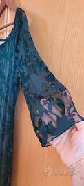 Elegante vestito da donna in pizzo elasticizzato, aderente, colore verde, con maniche trasparenti a gomito, tg 42.