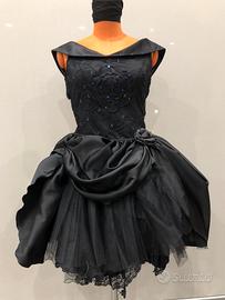 Bellissimo ed elegantissimo vestito in raso, per un evento speciale o 18°. Smanicato, con ampio collo e risvolto. Taglia 38/40, corto sul ginocchio. Realizzato a mano, da Sarta Professionista: - tulle nero, arricciato nella parte interna, con uno strato di pizzo nero; - corpetto avvitato, finemente ricamato con effetti floreali; - piccoli luccichini blu sparsi sul corpetto; - rosa nera, sul lato sinistro, con luccichini blu; - chiusura posteriore con cerniera e piccolo bottone; - ulteriore nastrino di chiusura di abbellimento.