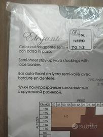 Eleganti calze autoreggenti made in Italy con balza in pizzo alto di colore nero.20 denari semi-velate del brand Mario scovoli,Mantova ,Italy.Taglia 1/2 : come da tabella presente sul retro della confezione vestono fino ad 170 cm e 70 kg di peso.Nuove in confezione sigillata.Possibile consegna a mano ad Arcore,Monza,Sesto,Milano.