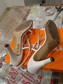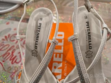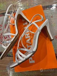 Eleganti sandali con tacco Pittarello. - Design con cinturini sottili e dettagli glitter. - Colore bianco lucido con inserti argento. - Misura 38.
