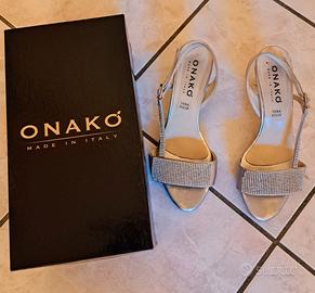 VENDO UN PAIO DI ELEGANTI SANDALI DA DONNA, N. 37, COLORE ARGENTO, VERA PELLE, MADE IN ITALY, MARCA ONAKO. TACCO CM. 6,5. IN OTTIME CONDIZIONI