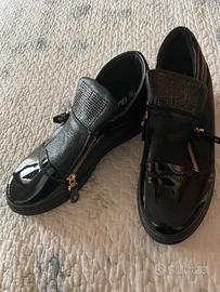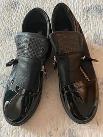Moderne scarpe tennis con zeppa interna, ideali per slanciare la statura con discrezione e massimo comfort, realizzate in PU nero lucido e impreziosite da raffinate pietrine nere brillanti che donano un tocco glamour e contemporaneo; la doppia cerniera rende la calzata pratica e veloce, unendo funzionalità e stile urbano, mentre il design sport-chic le rende perfette per il tempo libero, lo shopping o look casual ma curati; queste sneakers sono la scelta ideale per chi desidera comodità, altezza e moda in un’unica scarpa, senza rinunciare a personalità ed eleganza. Numero 40.