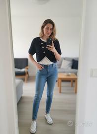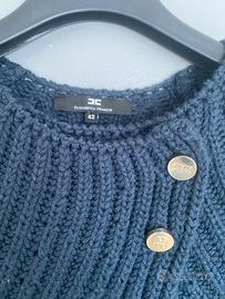 Cardigan corto Elisabetta Franchi in maglia grossa, colore blu navy, taglia 42 EU. Realizzato in filato pesante a coste larghe, perfetto per la mezza stagione. Modello a maniche corte con chiusura frontale diagonale e tre bottoni dorati logati. Il capo è in ottime condizioni, senza segni visibili di usura, presenta uno stile moderno e sofisticato, ideale da abbinare sia a look casual che eleganti. Lunghezza cropped che dona un tocco contemporaneo e valorizza la figura. Vestibilità regolare, ideale per chi indossa una 42 europea. Materiale morbido e caldo, perfetto per aggiungere carattere al tuo guardaroba. #Franchi #Cardigan #Blu #Corto #Elisabetta