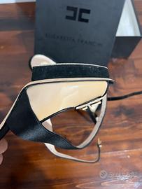 Originali scarpe donna Elisabetta Franchi modello sandalo con plateau alto 1,50 cm e tacco alto 12 cm, realizzate in fascia beige lucido + nero, con logo dorato frontale riconoscibile.