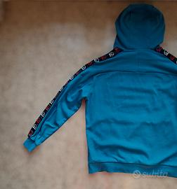 Felpa con cappuccio Ellesse originale, colore blu turchese iconico con bande logo repeat sulle maniche (stile tape classico anni 2000). Modello pullover con tasche laterali zipate, cappuccio regolabile con cordino e logo frontale discreto.