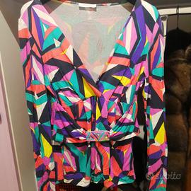 blusa a maniche lunghe con fantasia geometrica multicolore e scollo a V, nello stile a prodotti di marchi di lusso italiani come Emilio Pucci
