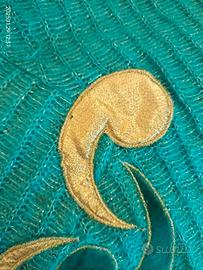 La maglia ha un collo alto dolcevita / ad anello e maniche lunghe a kimono / dolman / pippistrello, ed è decorata sul petto con applicazioni in velluto e foglia d’oro. Taglia indicata in etichetta IT44, ma la moda dell’epoca favoriva l’effetto oversize e la vestibilità è piuttosto ampia, per cui la maglia potrebbe vestire comodamente almeno una taglia in più (resto a disposizione per misure dettagliate).
