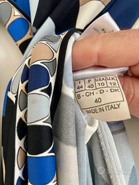 Raffinato vestito Emlio Pucci di lunghezza media. Scollo a V e maniche lunghe, presente come accessorrio il suo fiocco da potere legare al collo o alla vita. Pattern Pucci multicolore con prevalenza di blu cobalto, grigio scuro ed ecru.