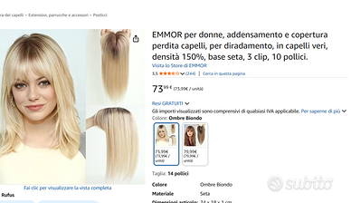 EMMOR per donne, addensamento e copertura perdita capelli, per diradamento, in capelli veri, densità 150%, base seta, 3 clip, 10 pollici.