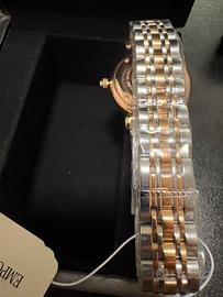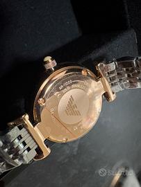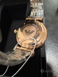 Orologio donna emporio armani AR11223, nuovo collezione gianni t-bar; movimento al quarzo solo tempo, cassa in acciaio rosato 28 mm, quadrante rosato con finitura cristalli, bracciale in acciaio/acciaio rosato, vetro minerale, resistenza acqua 3 atm