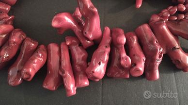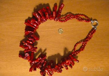 Enorme (circa 600 grammi) collana di corallo naturale, della tipologia "bambù - Taiwan" composta da 38 grandi rami + collo a tre fili di perline (dello stesso tipo di corallo) + chiusura in metallo. Originale anni '90. Visto il peso e la grandezza dei pezzi, ottima anche per eventuale smontaggio e rilavorazione.