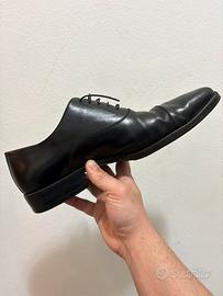 Scarpe eleganti da uomo Ermenegildo Zegna in pelle nera, modello stringato stile Oxford con punta liscia e cucitura frontale (cap toe). Made in Italy, qualità artigianale. Taglia 11 EE, equivalente circa a 45 / 45.5 EU con calzata larga (wide fit). Condizioni buone: pelle morbida con normali pieghe da utilizzo, segni sulla suola visibili ma ancora perfettamente utilizzabili. Ideali per outfit formali, ufficio, cerimonie o eventi eleganti.