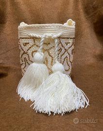 Splendido zaino colombiano originale (stile Kankuama), realizzato interamente a mano da artigiani locali. Ogni pezzo è unico, caratterizzato da colori vivaci e disegni geometrici che raccontano una storia millenaria.