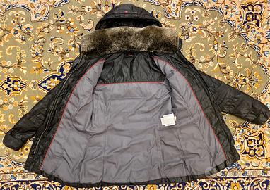 Vendo piumino parka Canadiens da donna, taglia 46, nero con cuciture rosse, collo in Lapin, cappuccio distaccabile, leggero caldo e traspirante, ottimo stato.