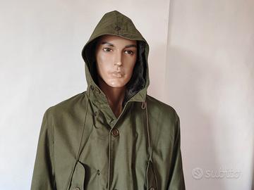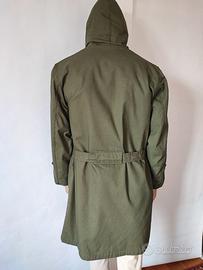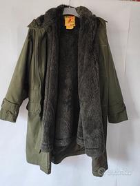 Eskimo uomo con cappuccio, interno in eco pelliccia sfoderabile fissato con clip, doppia chiusura con cerniera e bottoni, cintura in vita, quattro tasche, polsini in maglia, indossato pochissime volte, taglia S, spalle cm 50, manica cm 62, lunghezza cm 99