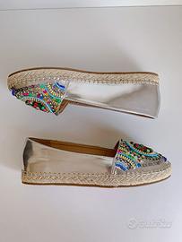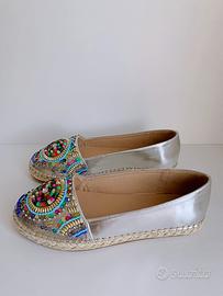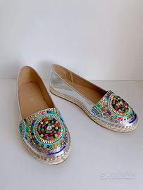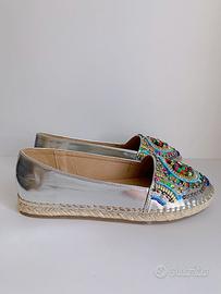 Espadrillas con tomaia argento in similpelle luminosa, decoro frontale con motivo in perline colorate multicolor, treccia perimetrale in corda, suola in gomma antiscivolo.