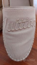 Espadrillas beige Louis Vuitton in tessuto. Taglia 39. Dettagli: signature LOUIS VUITTON in corsivo ricamata sulla tomaia (“Louis” piede destro, “Vuitton” piede sinistro). La pianta incordata (come i bordi) è rivestita da suola in gomma per garantire maggiore durata della calzatura nel tempo. Dotate di box e custodie in tessuto da usare per riporle quando non si utilizzano o in viaggio. Indossate una volta. Il prodotto è autentico vintage (codice identificativo CL1106), la ricevuta di acquisto é stata smarrita.