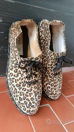 Originali espadrillas chiuse con lacci in stile "oxford" in tela stampata leopardata.