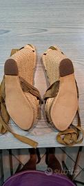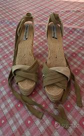 Espadrillas marca Pilar Burgos, in tela colore beige e cachi (verde militare). Con tacco in corda 11 cm. Taglia 36. Usate 1 sola volta.