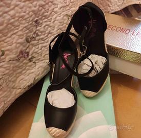 Vendo bellissimi Espadrillas neri zeppa in rafia 12cm con punta chiusa . Numero 36. NUOVI, MAI INDOSSATI. 18,00€