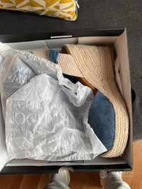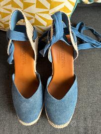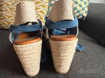 Espadrillas tacco 10, marca prima donna, colore blu jeans con laccetti alla caviglia. Indossate una sola volta Misura:40 Altezza zeppa: 10cm