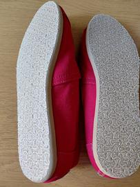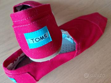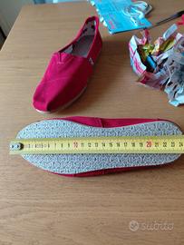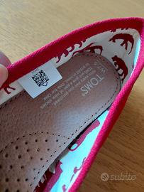 espadrillas Alpargata di TOMS. In tela (canvas) di colore rosso, MAI USATE, ma senza etichetta e scatola originale. Design Slip-on: Scarpe senza lacci con inserto elastico a "V" per una calzata facile. Materiali: Tomaia in tela di cotone suola in EVA. Dettagli Interni: Rivestimento in tessuto, con stampe decorative, sagome di animali della savana. Leggerissime con plantare comodo e rifinito. La misura originaria è W 7.5 che in Italia corrisponderebbe a 38, ma calzano piccole quindi 37, misurandole sono 24,5 cm.