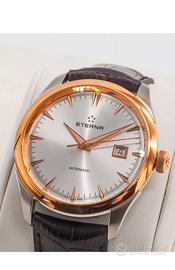 NUOVO 1948 Legacy Date, automatico, acciaio/pvd oro rosa, pelle marrone con chiusura déployante, quadrante argento, lunetta fissa in pvd oro rosa. Quadrante argentato con lancette e indici in oro rosa. Indici dei minuti intorno al bordo esterno. Tipo di quadrante: Analogico. Datario a ore 3. Movimento automatico Sellita calibro SW300-1 con riserva di carica di 38 ore. Vetro zaffiro antigraffio. Corona a strappo/spinta.