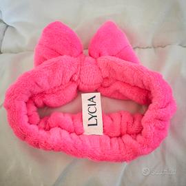 Fascia per capelli elasticizzata Lycia, nuova, mai indossata. Ideale per skincare e make-up, tessuto soffice, colore rosa intenso, con grande fiocco decorativo frontale.