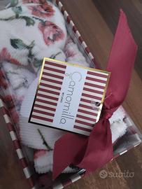 Set regalo composto da fascia per capelli +asciugamano viso in ciniglia con bellissime rose, firmati Camomilla Milano. Nuovi, con confezione originale e cartellino, in vendita perché doppio regalo.